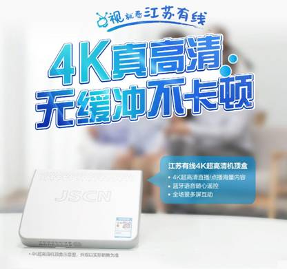 江蘇有線4K超高清機(jī)頂盒,兼具廣電真4K、高清電視直播、時(shí)移回看、互聯(lián)網(wǎng)視頻點(diǎn)播、人工智能語(yǔ)音控制、視頻通話、同屏推送等眾多功能。