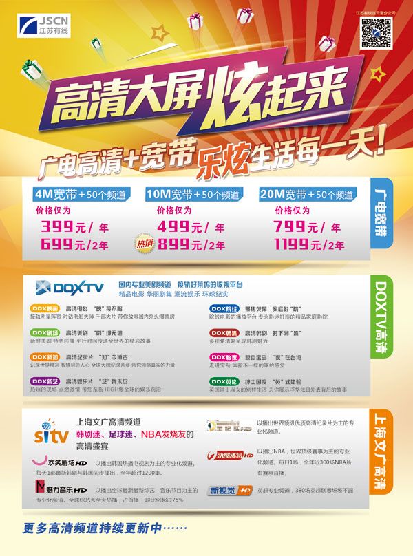 無以倫比的動(dòng)感畫面、多聲道環(huán)繞立體聲的逼真效果,大畫面、大場景、大制作的中外影片帶您步入高清新“視界”。高清頻道 目前可免費(fèi)收看的高清頻道有CCTV-1高清、CCTV-5+高清、北京衛(wèi)視高清、東方衛(wèi)視高清、江蘇衛(wèi)視高清、湖南衛(wèi)視高清、黑龍江衛(wèi)視高清、深圳衛(wèi)視高清、廣東衛(wèi)視高清和浙江衛(wèi)視高清等10家公共頻道,此外近期又新增CCTV-3高清、CCTV-5高清、CCTV-6高清、CCTV-8高清等4套高清節(jié)目。另外客戶也可根據(jù)意愿開通付費(fèi)節(jié)目DOX四套高清頻道和新視覺五高清頻道。