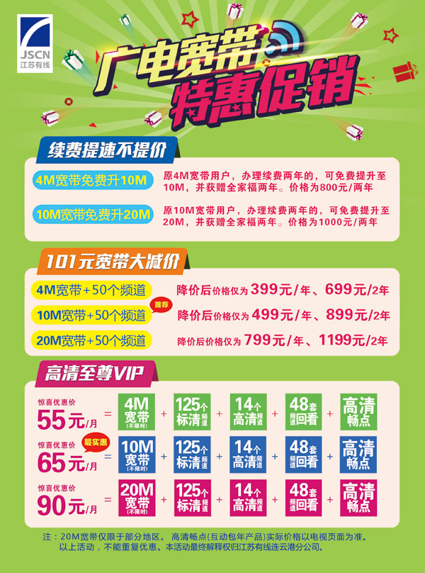 廣電寬帶--以速度和內(nèi)容取勝。在不斷提升速度的同時(shí),以豐富多彩的內(nèi)容,為用戶(hù)奉獻(xiàn)高速優(yōu)質(zhì)、價(jià)格實(shí)惠的家庭寬帶服務(wù)產(chǎn)品。