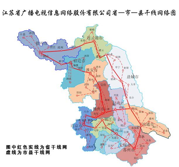江蘇省廣播電視傳輸網(wǎng)絡(luò)由省-市-縣三級網(wǎng)絡(luò)組成,覆蓋全省13個省轄市、66個縣(市)、967個鄉(xiāng)鎮(zhèn),共2500萬戶家庭,并連接了眾多企、事業(yè)單位及商務(wù)樓宇,具備了全程全網(wǎng)、高速雙向的信息服務(wù)能力。