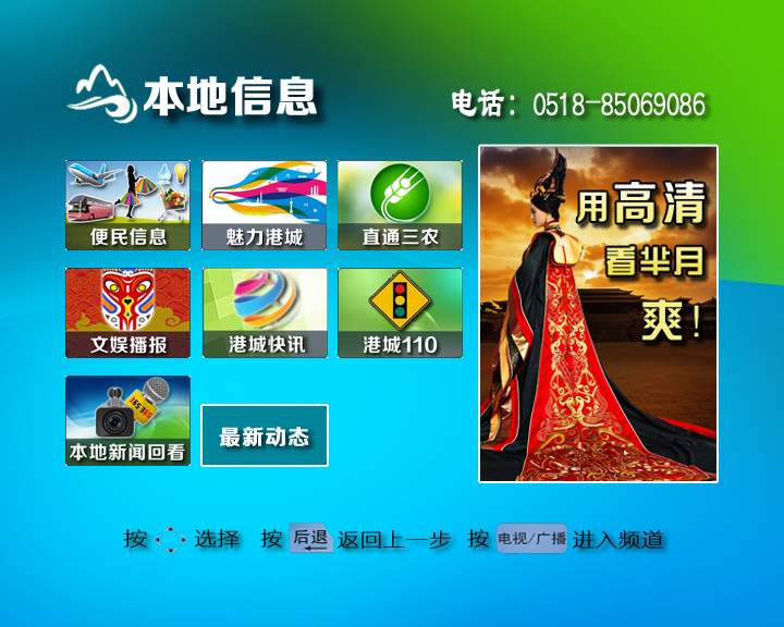 “數(shù)字電視本地信息平臺”是江蘇有線連云港分公司新近重點打造的服務民生、宣傳本地政務信息互動平臺。在互動電視中,“本地信息”與“數(shù)字電視”、“互動電視”并列組成開機界面中的3大基本內容。本地信息平臺帶有濃厚的本地特色,目前共設有便民信息、直通三農、勞動就業(yè)、文化港城、港城紅綠燈、電視商城、魅力港城、同步課件等8個版塊,每個版塊又根據(jù)內容的不同分設不同的子欄目。