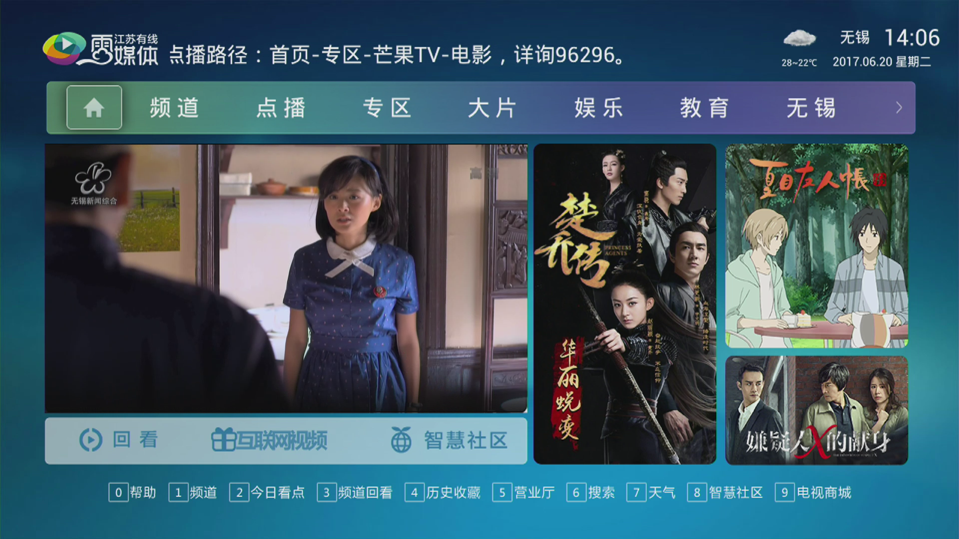 互動電視是江蘇廣電網(wǎng)絡(luò)無錫分公司為用戶提供的集合視頻點播、節(jié)目回看、資訊服務(wù)等一系列內(nèi)容的高品質(zhì)有線電視服務(wù)。互動電視打破了傳統(tǒng)的“你播我看”的電視收看方式,用戶可以通過點播、回看等功能實現(xiàn)與電視的互動?;与娨暰邆潆娨暪?jié)目頻道更多,圖像質(zhì)量更高,音質(zhì)效果更好,收視方式更新,節(jié)目播放時間更長等諸多優(yōu)勢,能為用戶創(chuàng)造更加自由、精彩的數(shù)字電視生活。
