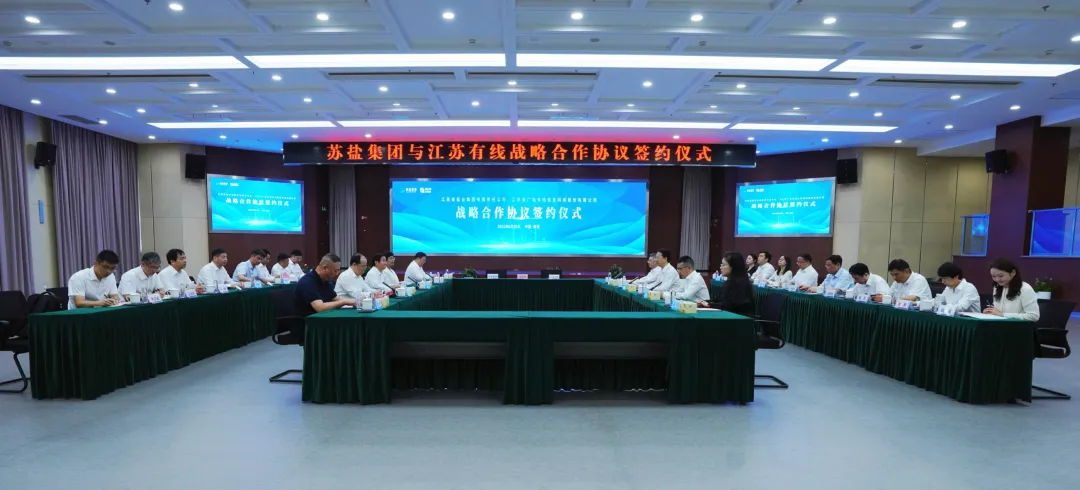 蘇鹽集團(tuán)黨委副書記、總經(jīng)理王海青出席簽約儀式。江蘇有線黨委副書記、副總經(jīng)理匡暉主持簽約儀式。江蘇有線黨委委員、總會(huì)計(jì)師王展,蘇鹽集團(tuán)黨委委員、副總經(jīng)理尹同陽(yáng)分別代表雙方簽訂合作協(xié)議。江蘇有線黨委委員、副總經(jīng)理施茜,蘇鹽集團(tuán)黨委副書記、工會(huì)主席王勝,蘇鹽集團(tuán)黨委委員、副總經(jīng)理蔣剛,以及雙方相關(guān)單位(部門)負(fù)責(zé)人參加簽約儀式。