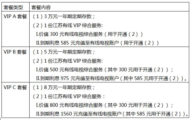 辦理“有線寶”VIP套餐的客戶,自愿同意將到期的1.95%儲蓄利息和“有線電視綜合服務(wù)”均充入同一有線電視用戶賬戶,則江蘇有線將按照885元/年的優(yōu)惠價格為該賬戶開通“江蘇有線VIP綜合服務(wù)”一年。